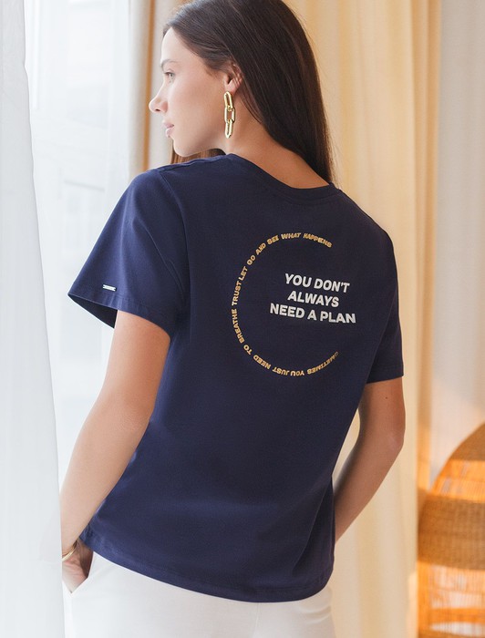 Состав: 92%Хлопок 8%ПУ Параметры модели на первом фото: Рост 177, бюст 78, талия 59, бедра 90Перевод надписи: «Не всегда нужен план. Иногда просто нужно сделать вдох, довериться, и ты увидишь, что произойдет» Футболка выполнена из премиального хлопка. Крупная надпись выполнена красками, маленькая - золотой фольгой с устойчивым покрытием. Наличие эластана в составе способствует комфорту и формоустойчивости, помогая сохранить изделие в течении долгого времени в идеальном состоянии. Модель дополнена фирменным металлическим логотипом бренда.