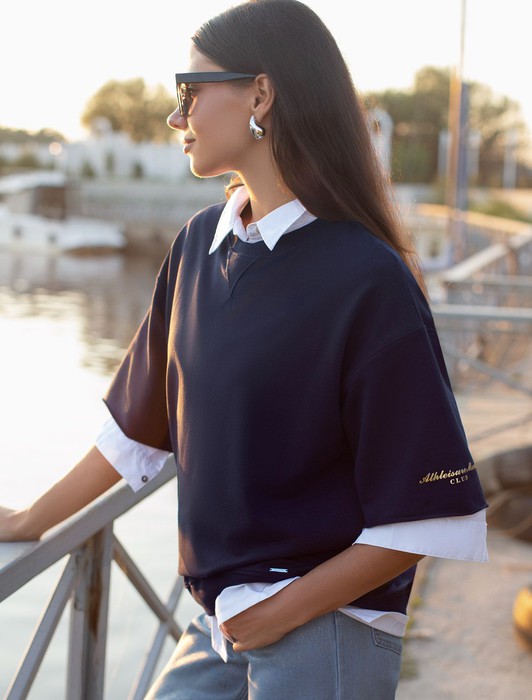 Состав: 95%Хлопок 5%ПУ Плотность: 240 Г/м2 Параметры модели на первом фото: Рост 172, бюст 88, талия 64, бедра 88Перевод принта: Athleisure mood club - клуб любителей спортивного стиля. Футболка свободного кроя со спущенным плечом выполнена из футера двухнитки с эластаном. Лаконичный принт нанесен фактурной краской. Эластичный материал гарантирует комфорт и формоустойчивость. Сочетается в костюме с брюками D44.138, D44.139 и шортами D48.008. Изделие дополнено металлическим логотипом бренда.