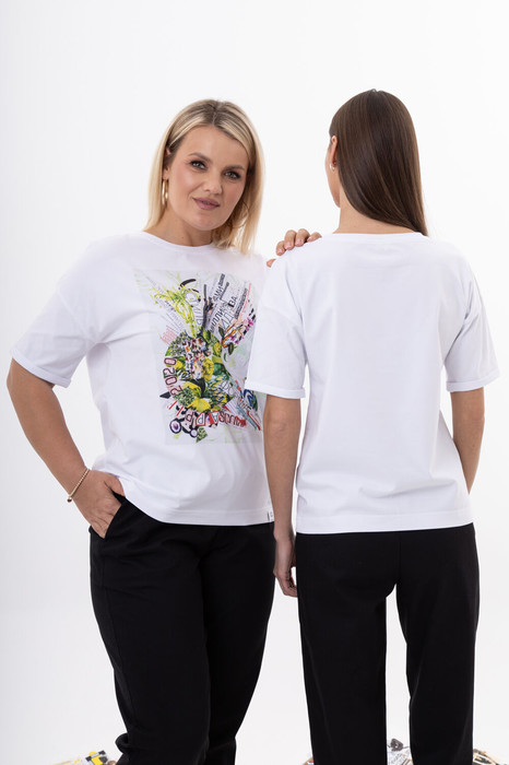 Футболка изготовлена из мягкого хлопка с добавлением эластана, который обеспечивает идеальную посадку, ткань прекрасно дышит и обеспечивает легкость. Нейтральная белая база позволяет принтам оставаться главным акцентом, сочетая футболку с джинсами, юбками, пиджаками или oversize-кардиганами.