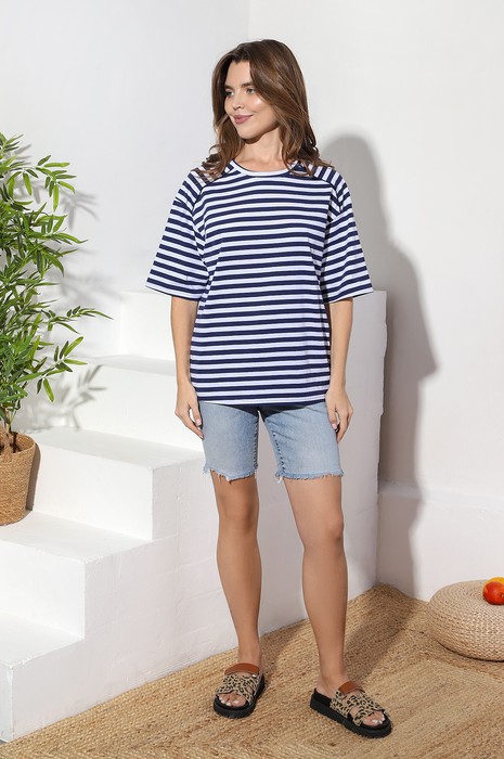 Футболка молодежная их трикотажного полотна кулирка» в полоску, свободная, с втачными рукавами, горловиной овальной формы, обработанной притачной бейкой из основного материала. Полочка и спинка с двумя небольшими косыми кокетками и отделочным кантом в швах соединения кокеток с основными деталями, кант из контрастного материала.