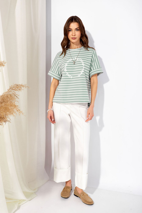 Джемпер прямого силуэта из трикотажного полотна. Горловина округлая. Рукав втачной, по низу манжета. По бокам разрезы, спинка длиннее переда. По центру дизайнерская печать.