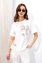 Джемпер прямого силуэта из трикотажного полотна. Горловина округлая. Рукав втачной, по низу манжета. По бокам разрезы, спинка длиннее переда. По переду и спинке дизайнерская печать. В комплект входит съемный декор.