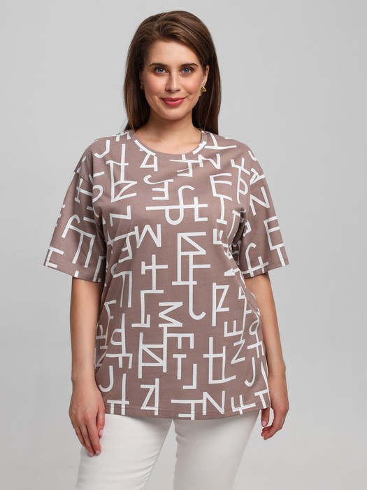 Футболка женская из трикотажного полотна «кулирка» с набивным рисунком, свободного покроя, со спущенным плечом и втачными рукавами длиной до локтя, горловиной овальной формы, обработанной притачной бейкой, в нижней части боковых швов – разрезы.