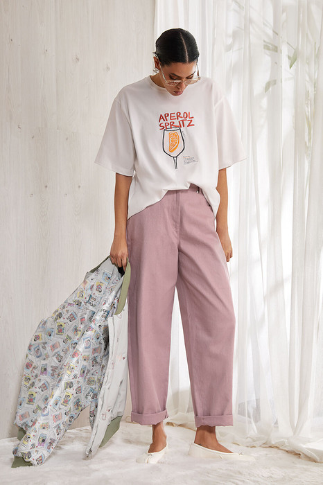Объемная футболка оверсайз выполнена из плотного хлопкового трикотажного полотна (интерлок). Спущенная линия плеча. Рукав до локтя.. Горловина круглая с притачной планкой. Дизайнерский принт “APEROL” на передней половинке футболки.
