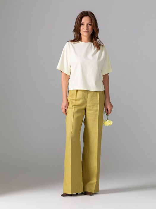 Модель прямого силуэта, с цельнокроеным рукавом, с группой складок по левому плечевому шву. Горловина обработана бейкой.