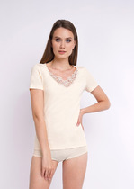 Джемпер из трикотажной хлопковой ткани, со спущенным плечом. По переду джемпера расположены декоративные элементы. Вырез горловины круглый, оформлен бейкой. Спинка без среднего шва.