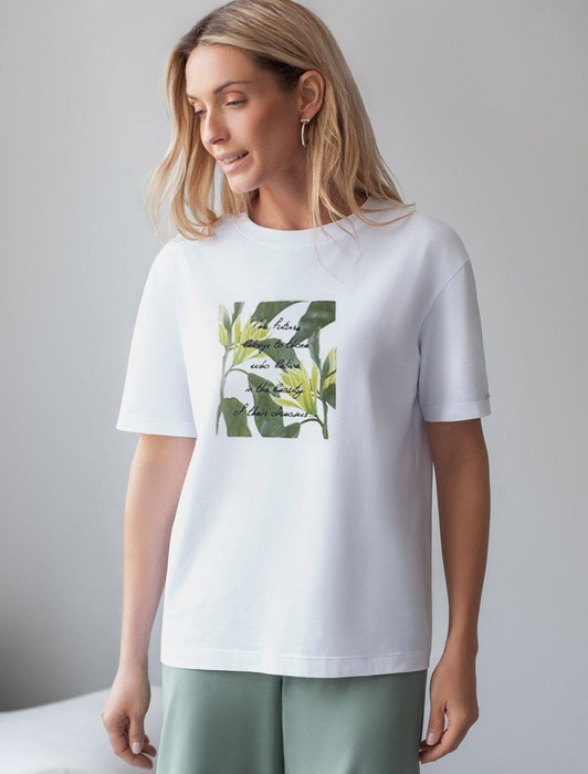 Особое внимание привлекает стильный принт в виде листьев и цветов с надписью, выполненный красками с устойчивым покрытием, который добавляет изделию оригинальности и позволяет выразить индивидуальность. Перевод надписи: The future belongs to those who believe in the beauty of their dreams - Будущее принадлежит тем, кто верит в красоту своей мечты.