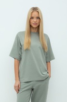 Футболка молодежная из гладкокрашенного полотна «кулирка с лайкрой», свободного покроя, со спущенной линией плеча, втачными рукавами длиной до локтя, горловиной овальной формы, обработанной втачной планкой. Изделие дополнено декоративной нашивкой, в боковых швах выполнены разрезы.