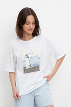 Футболка женская из гладкокрашенного трикотажного полотна «кулирка», свободного силуэта, с боковыми швами, переходящими в рельефы, в правом соединительном шве выполнен разрез. Горловина овальной формы обработана втачной планкой и дополнена декоративным элементом.