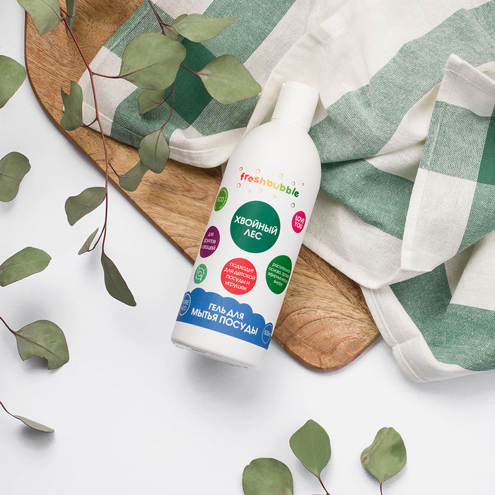 Натуральный гель для мытья посуды «Хвойный лес» подходит для детской посуды и игрушек, а также фруктов и овощей.