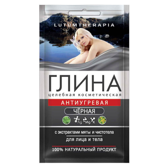 Чёрная глина – уникальный продукт. В косметологической сфере это средство считается незаменимым на протяжении нескольких веков, так как чёрная глина успешно борется с такими проявлениями, как дисфункция сальных желез и расширенные поры на лице, убирает следы и заметно разглаживает рубцы от прыщей, угревой сыпи и гнойников, очищает кожу Т-зоны от комедонов (чёрных точек), дезинфицирует, устраняет жирный блеск, слегка подсушивает, придает отдохнувший, свежий вид увядающей коже. Чёрная глина– это уникальный природный адсорбент, помогающий мягко очистить кожу, а её минеральный комплекс обладает антисептическими, очищающими, противовоспалительными и регенерирующими свойствами. Минералы чёрной глины благоприятно влияют на все типы кожи, но особенно эффективен этот вид глины для ухода за жирной и проблемной кожей. Экстракты мяты и чистотела усиливают очищающее и противовоспалительное действие глины, успокаивают и тонизируют кожу.