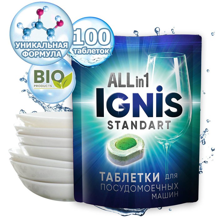 Таблетки IGNIS ALL in1 Standart подходят для мытья посуды и столовых приборов в посудомоечных машинах любого типа. Полностью смываются водой, не содержат синтетических ароматизаторов, фосфатов и хлора, подходят для мытья детской посуды.