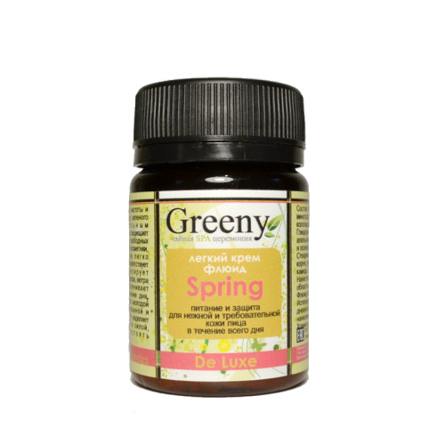 Крем-флюид Greeny «The Spring» - дает нежной и требовательной коже необходимое питание и защиту в течение всего дня. Благодаря составу высокой чистоты и концентрированному отвару зеленого чая обладает сильным антиоксидантным эффектом, защищает от пагубного воздействия свободных радикалов из декоративной косметики, обеззараживает. Крем легко впитывается и совсем не препятствует дыханию кожи; гарантирует максимальную защиту от мороза, ветра и солнца, а также обеспечивает превосходный уход в течение дня. Активные компоненты (СО2 экстракты, эфирные масла, цитрусовый микс) насыщают кожу витаминами, увлажняют, активизируют природную барьерную функцию и помогают бороться с внешними раздражителями, ставящими под угрозу молодость вашей кожи. Текстура: богатая, но чрезвычайно лёгкая, не оставляющая ощущения «маски». Активный крем создан для молодой нормальной, комбинированной и склонной к жирности кожи 20+, наделяет ее жизненной энергией и силой, помогает противостоять переутомлению.