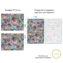 Открытка + конверт ФИОЛЕТОВЫЕ ЦВЕТЫ НА ГОЛУБОМ ФОНЕ