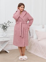 Халат женский из набивного кулирного полотна, приталенный силуэт. Горловина круглая обработана обтачкой, без рукава. На полочке и спинке рельефы с подрезами на сборке, в боковых швах внутренние карманы, низ изделия обработан на плоскошовной машине, застежка на петли-пуговицы.