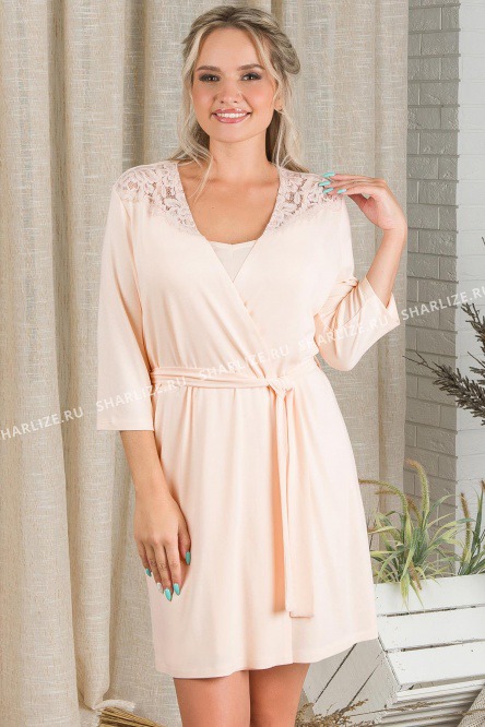 Легкий и приятный к телу халат из вискозы длиной выше колен. Халат на запах с поясом в комплекте, с помощь которого можно регулировать объем и подчеркнуть линию талии. Изделие выполнено в нежном оттенке экрю, линия плеч декорирована кружевом, длина рукавов практичная 3/4. Модель можно комбинировать с сорочкой арт.0371 в том же цвете.