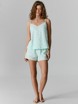Халат женский из трикотажного полотна «кулирка» с набивным рисунком, прямого силуэта, с короткими втачными рукавами, карманами в боковых швах и центральной бортовой застежкой на обметанные петли и пуговицы. Горловина – овальной формы, переходящая в небольшой v-образный вырез выше верхней пуговицы. Входы в карманы и горловина спинки окантованы.
