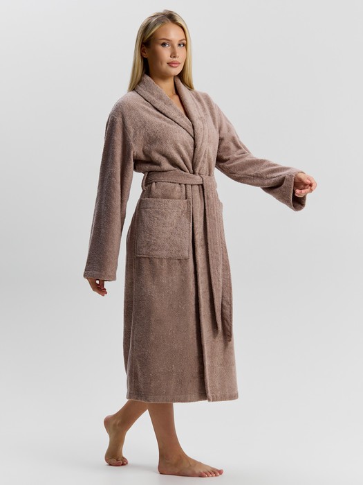Женский халат из двустороннего махрового хлопкового полотна. Модель на запах, с поясом в шлёвках, с боковыми карманами, с воротником "шаль", с петлей-вешалкой по горловине спинки.
