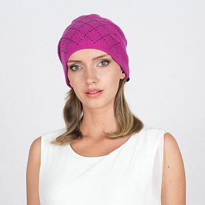 Элегантная шапка-бандана с мягкой драпировкой складок и фигурными защипами. Сзади украшена бантом из основного полотна с отстрочкой черного цвета. Спереди оформлена изящным рисунком «клетка», выполненным из черных ювелирных страз.