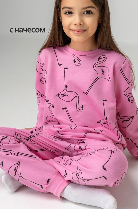 Детская теплая пижама с брюками для девочек выполнена из футера с начесом. Пижама для детей станет любимым атрибутом отдыха юной принцессы благодаря свободному крою и нежному розовому цвету. Милый принт Фламинго поднимает настроение и создает уютную атмосферу.