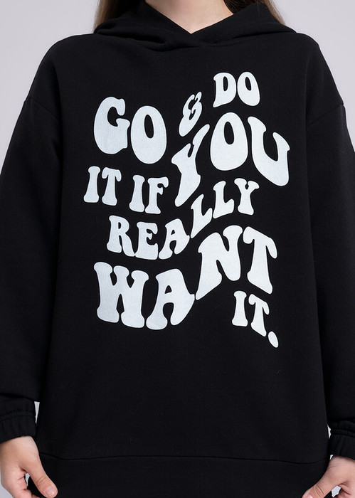 Худи среднего объёма с капюшоном из футера 3х нитка петля. По низу рукава резинка. Впереди принт.