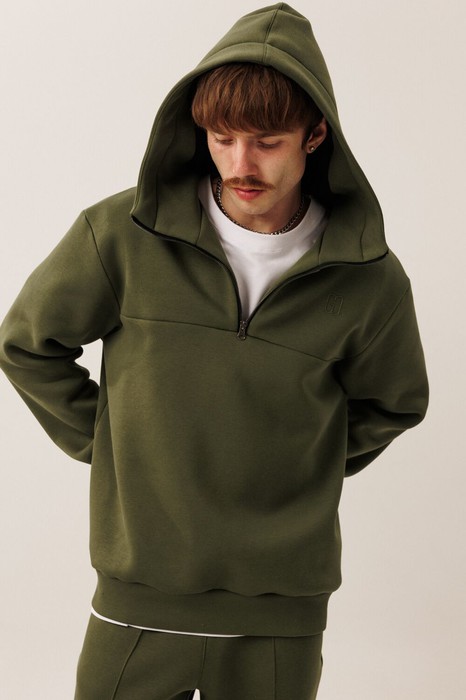 Этот джемпер от GOwear отлично подойдет для дома, прогулок, путешествий и отдыха. Сделан из теплой, комфортной ткани. Джемпер имеет  двойной капюшон и короткую застежку - молнию черного контрастного цвета по центру переда. На переде с левой стороны выполнена вышивка в цвет ткани, а также расположена горизонтальная кокетка. Джемпер имеет прямой силуэт. Низ джемпера и манжеты выполнены из кашкорсе.