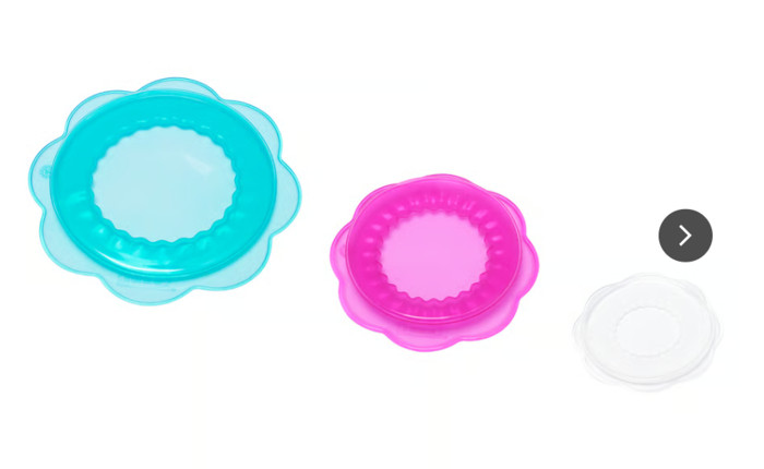 В комплект входят: 1 прозрачная крышка для продуктов (диаметр 6 см), 1 розовая крышка для продуктов (диаметр 8 см) и 1 бирюзовая крышка для продуктов (диаметр 10 см).