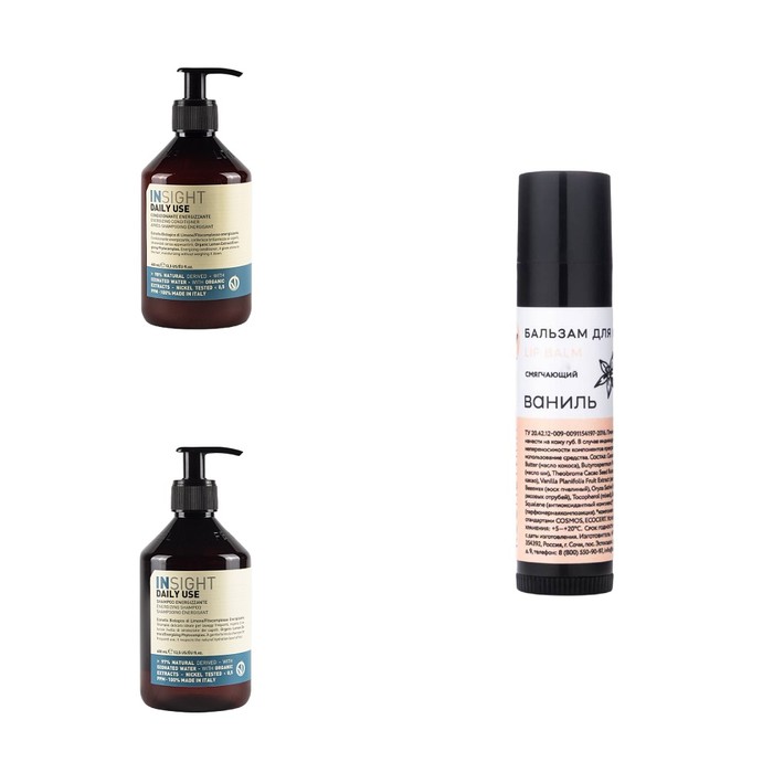 Набор состоит из самых необходимых средств для ежедневного ухода за волосами и губами:
