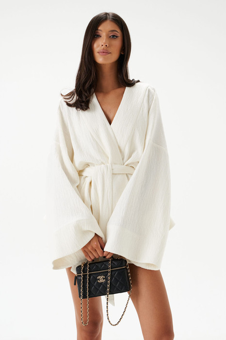 Кардиган свободного кроя. Выполнен из хлопкового полотна белого цвета муслин. Без подкладки. Вырез горловины V-образный. Рукав втачной, спущенный, широкий. На уровне линии талии шлёвки. В комплекте пояс из основной ткани изделия. Длина рукава от линии втачивания 47 см. Длина спинки 70 см. Кардиган дополнят шорты А1530