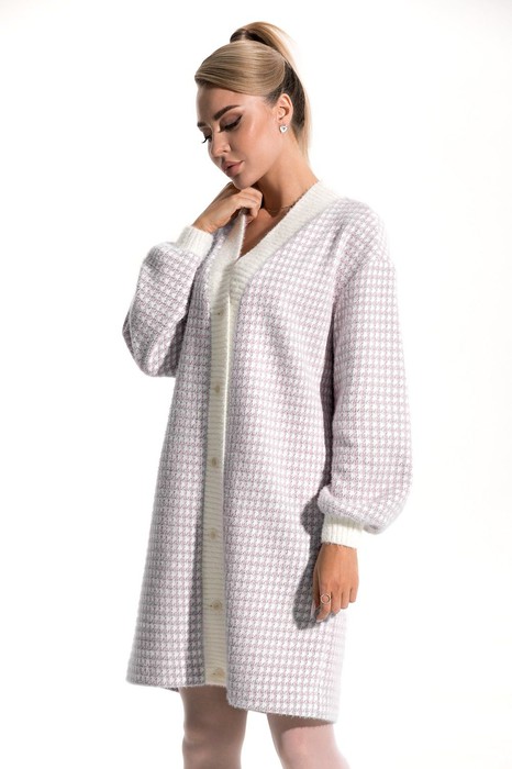 Кардиган объемный, прямого силуэта, с центральной застежкой на петли и пуговицы. По борту полочек и горловине спинки- отрезная планка. Кардиган без боковых швов, плечо спущенное. Рукав втачной, с отрезной манжетой.
