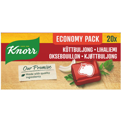 Бульон Knorr – идеальный помощник в приготовлении вкусной еды. Много кубиков бульона подходят для использования в качестве основы соусов, хороши для супов и запеканок. В упаковке 20 кубиков, из одного кубика получается 0,5 л готового бульона. Состав: Состав: соль, растительные жиры (пальмовый, ши, соль), крахмал, ароматизатор, сахар, дрожжевой экстракт, говяжий жир 3%, порошок говяжьего бульона 2,1%, карамельный сироп, луковый порошок, мальтодекстрин, петрушка, морковь, специи (включая семена сельдерея), антиоксидант (экстракт розмарина). Пищевая ценность / 100 г: Энергетическая ценность: 318 ккал 1329 кДж Жир: 0,5 г из них полезно: 0,3 г Углеводы: 0,5 г из них сахар: 0,5 г Пищевые волокна: 0,5 г Белок: 0,5 г Соль: 0,86 г Лактоза: - .