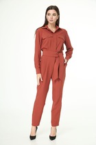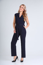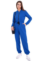 Комбинезон женский,отрезной по линии талии и присобран на резинку по спинке. Рукав 3/4. По переду на брюках одна пола на запах завязывается на талии полупоясом.
