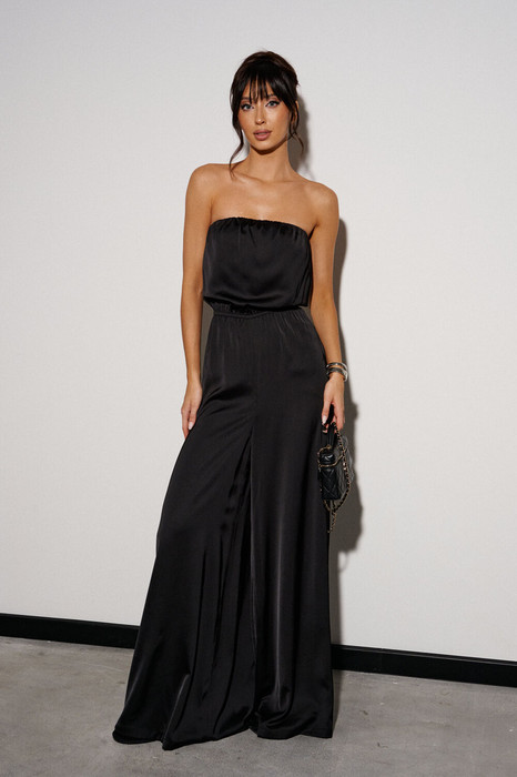 Комбинезон с открытыми плечами полуприлегающего силуэта. Выполнен из мягкой струящейся ткани чёрного цвета. Без застёжки. Линия декольте на резинке. Лиф выполнен из двойной ткани. Отрез по линии талии на резинке. В боковых швах брючин карманы. Длина по боковому шву 135 см.