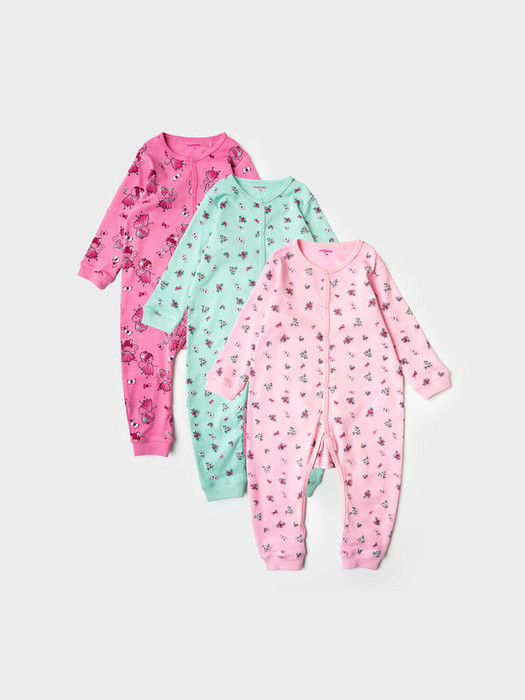 Набор для новорожденной девочки. В комплект входят три детских комбинезона. Все модели с длинными рукавами. Удобная застежка на кнопках начинается от горловины и продолжается по низу – это облегчает переодевание и смену подгузника. Горловина круглая, с мягкой окантовкой. На манжетах рукавов и внизу штанин – эластичные вставки из риба, которые хорошо держат форму. Каждый комбинезон украшен нежным принтом: цветочным или с милыми персонажами. Материал - 100% трикотаж интерлок.