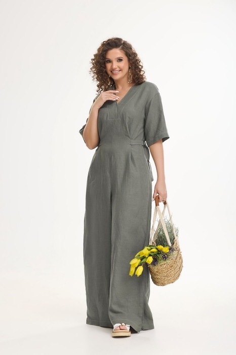 Комбинезон женский, прямого силуэта oversize, со спущенной линией плеча. Рукав втачной, одношёвный, короткий. Спинка отрезная по линии талии. Верхняя часть спинки со средним швом и разрезом, заканчивающимся застёжкой на навесную петлю и пуговицу. Головина V-образной формы, обработана планками. Перед с вытачкой по линии талии. Нижняя часть переда с односторонней складкой до бокового шва. В боковых швах карманы. На уровне талии, переда и спинки декоративные элементы, в виде полу пояса, на полукольцах, которые позволяют регулировать ширину комбинезона по талии. Комбинезон декорирован контрастными отделочными строчками.