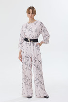 Комбинезон с застежкой на потайную молнию с среднем шве спинки, без рукавов. По верхней части переда нагрудные и талиевые вытачки. В боковых швах нижней части комбинезона выполнены карманы . Спинка со средним швом, талиевыми вытачками. Шов по талии присборен на резинку. Комбинезон со съемным поясом. По боковым швам расположены шлевки для пояса.