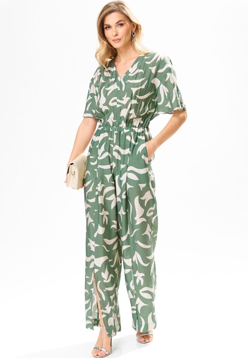 Комбинезон женский из штапеля, свободного силуэта, со спущенной линией плеча, с втачным поясом на уровне линии талии, в который вставлена эластичная тесьма. Лиф детали переда комбинезона со средним швом, на уровне талии обработаны 2 складки. Нижние части с рельефными швами, которые заканчиваются разрезами, в боковых швах обработаны наклонные карманы. Лиф детали спинки комбинезона с запахом, вверху которого обработан разрез с застежкой на 1 навесную петлю и пуговицу, по середине застежка на 1 потайную кнопку. На нижней части по шву притачивания пояса обработаны по одной вытачке на каждой половинке. Рукава втачные двухшовные, короткие, с разрезами. Вырез горловины комбинезона «V-образной» формы, обработан обтачкой.