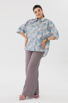 Удобные  зауженные брюки из лёгкой  ткани, со льном в составе. Брюки свободного прилегания по бедрам, в пояс вставлена эластичная тесьма с кулисой и втянутым шнурком. Вход в карман фигурный, наклонный к боковому шву. По низу брюк оформлены подвороты.