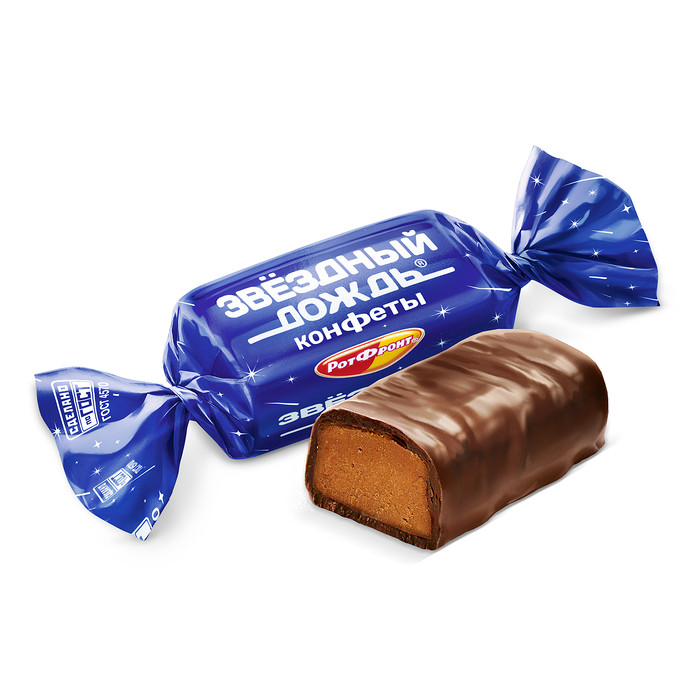 Конфеты «Звездный дождь» – темная, как бесконечный космос, помадка, покрытая шоколадной глазурью. Тающие во рту конфеты с ярким шоколадным вкусом, легкой терпкой ноткой и бодрящим ромовым ароматом. Начинка настолько нежная, что кажется похожей на шоколадный крем. Конфеты «Звездный дождь» особенно хорошо сочетаются с крепким черным чаем и черным кофе.