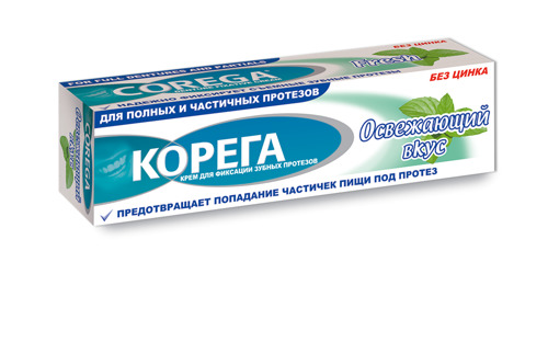 Средство для фиксации зубных протезов Корега Освежающий вкус обеспечивает надежную фиксацию зубного протеза в течение всего дня и дает вам комфорт и уверенность в течение всего дня. Кроме того, продукт не содержит цинк.