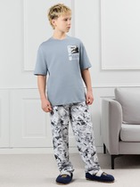 Костюм для мальчика. Ткань цвета хаки с рисунком в виде формул. Кофточка с длинным рукавом на манжетах. Брюки прямые, на манжетах