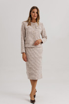 Костюм женский из кулирного полотна состоит из кофты и брюк. Кофта прямого силуэта, рукав-реглан длинный на манжете, горловина круглая, обработана окантовкой, низ изделия на поясе, на полочке принт. Брюки прямые, верх на поясе с резинкой, в боковых швах внутренние карманы, низ на манжете.