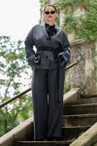 Костюм женский из кулирного полотна состоит из кофты и брюк. Кофта прямой силуэт, горловина круглая, по центру планка с застежкой на петли-пуговицы, рукав втачной 3/4, низ обработан на плоскошовной машине, на полочке принт. Брюки прямые, верх на поясе с резинкой, в боковых швах карманы, низ брюк на манжете.