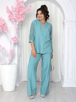 Костюм женский из кулирного полотна состоит из футболки и брюк. Футболка прямая, горловина круглая, рукав короткий, втачной, на полочке принт, низ изделия обработан на плоскошовной машине. Брюки прямые, верх на поясе с резинкой, в боковых швах вставки из отделочной ткани с печатью, низ изделия на резинке.