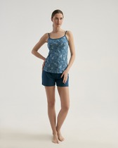 Костюм женский, состоящий из футболки с коротким рукавом и бриджей. Круглый вырез горловины обработан окантовкой. На полочке яркий рисунок ткани (купон).