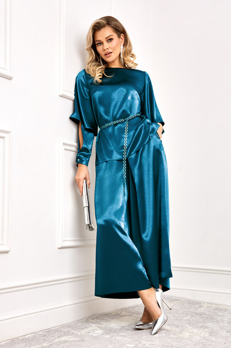 Элегантный и нарядный комплект, состоит из блузы и брюк. Изящная блуза прямого силуэта, выполнена из высококачественной ткани Твист с добавлением вискозы. Горловина блузы с округлым вырезом, по низу, по бокам, с небольшими разрезами. Рукав втачной, снизу с манжетой и застежкой на пуговицу. По спинке блуза с небольшим разрезом-капелькой и застежкой на пуговицу. Брюки прямые, выполнены из высококачественной ткани Твист с добавлением вискозы, по переду и спинке со складками, что придает модели особый шарм и нарядность. Пояс брюк по спинке с резинкой и застежкой сбоку на потайную молнию и пуговицу. Модель прекрасно подойдет для торжественного мероприятия и ежедневной носки. В комплект входит пояс-цепочка серебристого цвета, для придания образу еще большей нарядности и стильности.