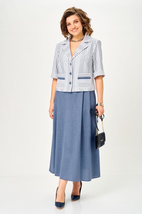 Комплект женский состоит из жакета и юбки. Элегантный женский жакет без подкладки с воротником пиджачного типа и застежкой на 3-и петли и пуговицы. По левой части переда накладные карман с декоративными планками. Рукав втачной двухшовный с манжетой по низу. Юбка А-образного силуэта  со складками по переду, в боковых швах карманы.  Для максимально комфортной посадки по бокам пояса вставлена эластичная резинка. Длина жакета 50 см, длина рукава 31 см, длина юбки 88 см.