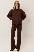 Костюм в стиле спорт-шик сочетающий в себе женственность и комфорт. Сочетание двух тканей трикотажного полотна и костюмной ткани добавляет оригинальность. Жакет со спущеным плечем и декорирован печатью по левой части переда, воротник пиджачного типа. По пинии плеча паты с полукольцом. Рукав втачной одношовный с манжетой по низу. Спинка с кокеткой и отлетной планкой. Понизу довяз и регулируемая кулиса. Брюки, слегка зауженные к низу, свободного силуэта. По переду вблизи боковых швов карманы. Для максимально комфортной посадки по поясу вставлена эластичная резинка.