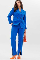 Костюм в стиле спорт-шик сочетающий в себе женственность и комфорт. Сочетание двух тканей трикотажного полотна и костюмной ткани добавляет оригинальность. Жакет со спущеным плечем и декорирован печатью по левой части переда, воротник пиджачного типа. По пинии плеча паты с полукольцом. Рукав втачной одношовный с манжетой по низу. Спинка с кокеткой и отлетной планкой. Понизу довяз и регулируемая кулиса. Брюки, слегка зауженные к низу, свободного силуэта. По переду вблизи боковых швов карманы. Для максимально комфортной посадки по поясу вставлена эластичная резинка.