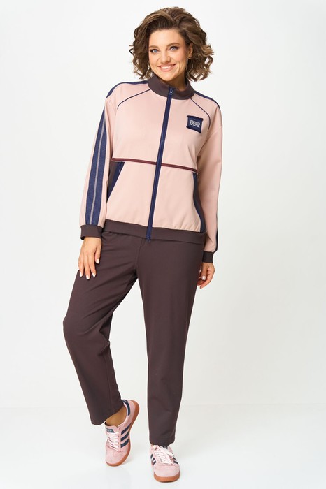 Этот стильный спортивный костюм из двух предметов сочетает в себе практичность и современный дизайн, идеально подходящий для активного образа жизни или повседневной носки. Комплект включает бомбер на молнии и брюки, выполненные в гармоничной цветовой палитре. Бомбер прямого силуэта с центральной застежкой-молнией, выполнен из мягкого трикотажного материала. Основной цвет — нежно-розовый с контрастными вставками темно-синего и шоколадного оттенка на рукавах и груди. Рукава украшены декоративными полосами, а на левой стороне груди расположен декоративный элемент с напечатанным логотипом для акцента. Манжеты и нижний край с резинкой обеспечивают плотную посадку, внутренняя подкладка отсутствует.